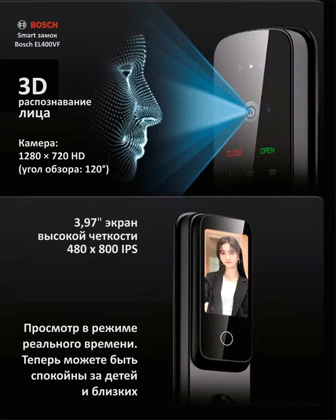 Замок оснащён цветным LCD-монитором диагональю 3,97 дюйма, обеспечивающим удобное управление и визуальный контроль.